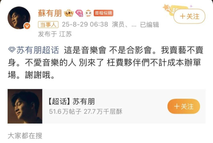也是因为被骂上了热搜,苏有朋才跑出来为自己的措辞不当道歉。他这个音乐会光是普通票都要将近1000块钱,粉丝想要合影没什么问题,只是苏有朋回复粉丝的态度确实挺让人心寒的。对着喜欢自己多年的粉丝说“卖艺不卖身”这种话确实不合适,但凡他说的委婉一些也不会被骂成这样。